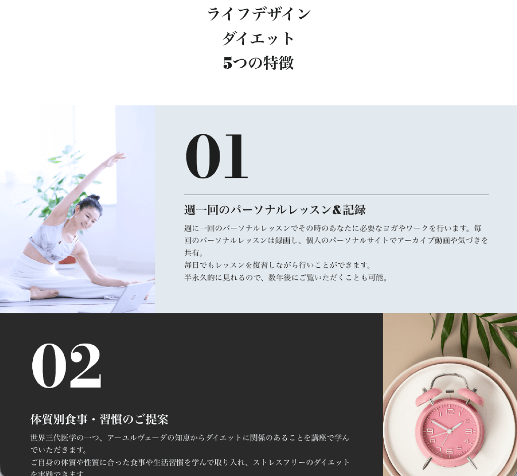 - 画像やアイコンの配置で視線誘導を意識し、セクション間の読みやすさとリズムを調整