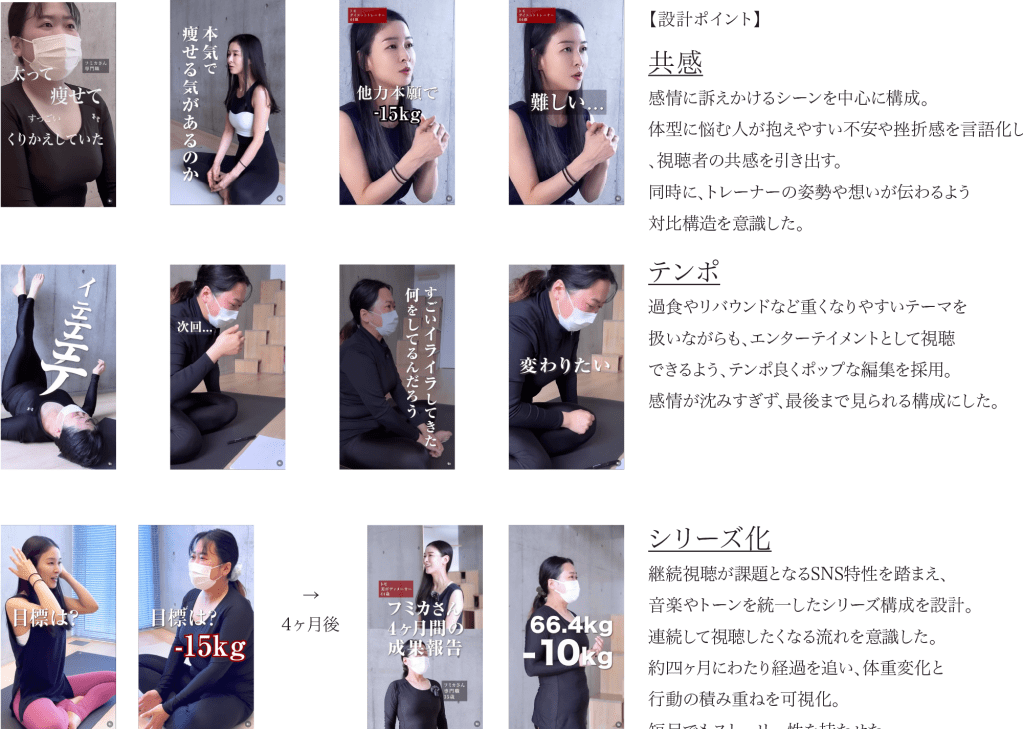 - スクロール中でも興味を引き、保存・視聴・LP誘導・申し込みまでつなげる必要があった